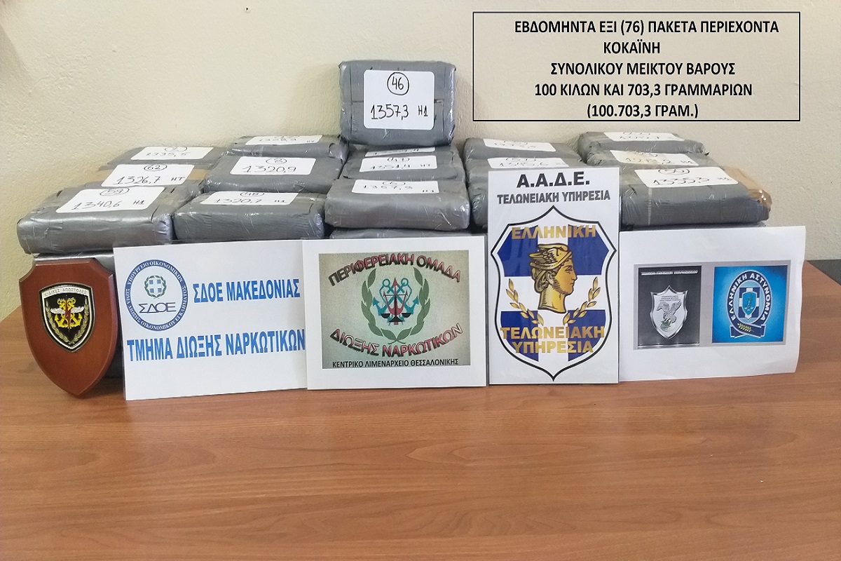 Μετά από ενδελεχή έλεγχο σε ένα εκ των εμπορευματοκιβωτίων εντοπίστηκαν και κατασχέθηκαν εβδομήντα έξι (76) συσκευασίες περιέχουσες ναρκωτική ουσία κοκαΐνη, συνολικού μικτού βάρους εκατό κιλών, επτακοσίων τριάντα γραμμαρίων και τριών δέκατων του γραμμαρίου (100.730,3gr). Πρωινές ώρες την 02/03/22, το ως άνω εμπορευματοκιβώτιο παραδόθηκε σε εγκαταστάσεις ιδιωτικής εταιρείας που εδράζεται στην Ε.Ο. Βέροιας – Νάουσας. Το Φ/Γ όχημα που μετέφερε το εμπορευματοκιβώτιο είχε τεθεί υπό διακριτική παρακολούθηση και με την είσοδο του στην εταιρεία πραγματοποιήθηκε επέμβαση από τα στελέχη του Κεντρικού Λιμεναρχείου Θεσσαλονίκης, με αποτέλεσμα την σύλληψη του οδηγού του Φ/Γ οχήματος, του νόμιμου εκπρόσωπου και τριών εργαζομένων της εταιρείας. Εν συνεχεία και κατόπιν προφορικής εντολής εισαγγελικού λειτουργού συνελήφθησαν τρεις (3) επιπλέον ημεδαποί ως εμπλεκόμενοι στην εν θέματι υπόθεση.