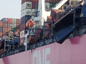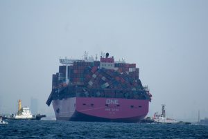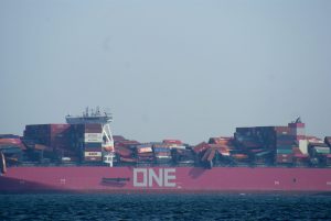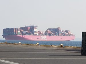 Το MV ONE Apus το οποίο βρισκόταν στον κόλπο της Οζάκα της Ιαπωνίας την Τρίτη,έχοντας σχετικά μία καλή εικόνα μετά την καταστροφή που έγινε στο πλοίο, το οποίο έχασε σχεδόν 2.000 εμπορευματοκιβώτια σε καταιγίδα στον Ειρηνικό Ωκεανό.