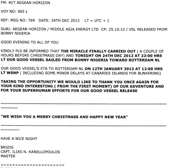 Το ευχαριστήριο τηλεγράφημα του καπετάνιου του ''Aegean Horizon''