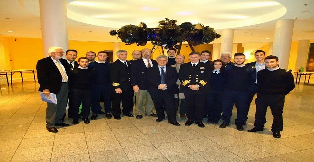 Η αποστολή της ΑΕΝ/ΣΥΡΟΥ ανάμεσα στους βασικούς συντελεστές του Συνεδρίου. Εμφανίζονται από αριστερά: Κων/νος Σουφλέρης (Τμηματάρχης ΔΕΚΝ-Α΄), Αντιπλοίαρχος Λ.Σ Ευρυβιάδης Σαπουνάς (Τμηματάρχης ΔΕΚΝ-Β΄), Γεώργιος Λιμάκης, Μιχαήλ Τζιώτης, Δημήτριος Δραγώνας, Αντιπλοίαρχος Λ.Σ Νικόλαος Πολέμης (Διοικητής ΑΕΝ/ΣΥΡΟΥ), Πλοίαρχος Λ.Σ Αλέξανδρος Θεοφανόπουλος (Διευθυντής ΔΕΚΝ), Κων/νος Μανάφης (Σύμβουλος Εκδόσεων Ιδρύματος Ευγενίδου), Λεωνίδας Δημητριάδης-Ευγενίδης (Πρόεδρος Ιδρύματος Ευγενίδου), Γεώργιος Χριστοφόρου, Γέωργιος Δούναβης (Αναπ/τής Διευθυντής ΑΕΝ/ΣΥΡΟΥ), Υποναύαρχος Λ.Σ Αχιλλέας Ματσάγγος (Επόπτης Ναυτικής Εκπαίδευσης), Νικόλαος Δημητριάδης, Ελένη Μπεναρδή, Ιωάννης Φραγκιάς (Καθηγητής Αγγλικής), Γεώργιος Ζεϊμπέκης, Ευάγγελος Τσινός, Μάριος-Ιωάννης Παπαδόπουλος.