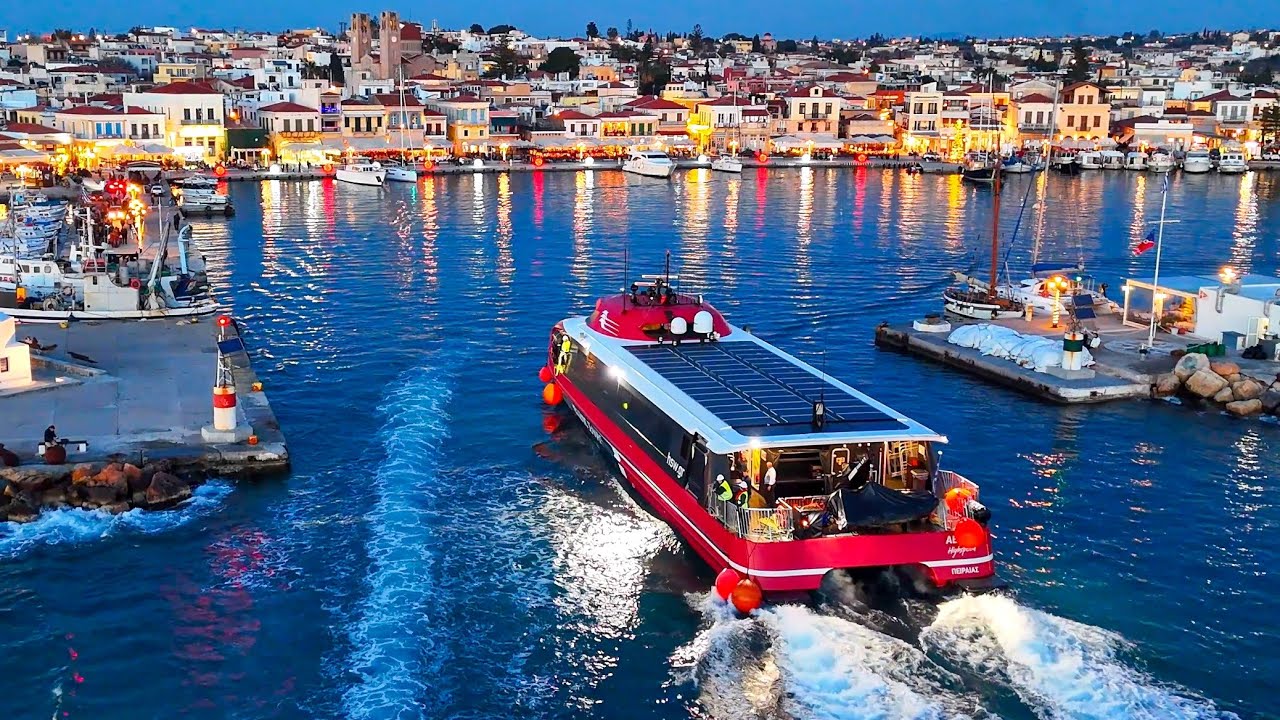 To Highspeed Aero 2 προσεγγίζει το λιμάνι της Αίγινας ερχόμενο από Αγκίστρι και πραγματοποιεί μια γρήγορη πλαγιοδέτηση στο γραφικό λιμάνι του νησιού.
