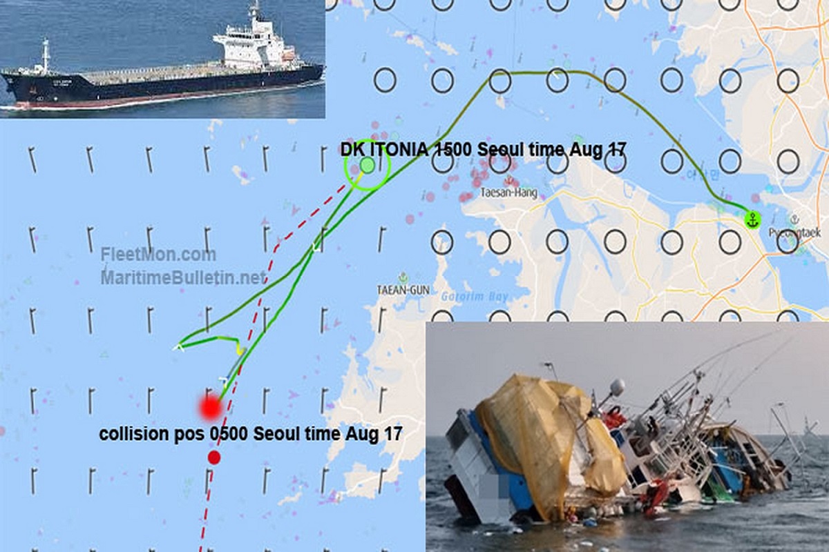 To κορεατικό αλιευτικό, 24 τόνων, συγκρούστηκε με φορτηγό πλοίο δυτικά της ακτής της κομητείας Taean, στην Κίτρινη θάλασσα, περίπου στις 05:00 ώρα Σεούλ στις 17 Αυγούστου.