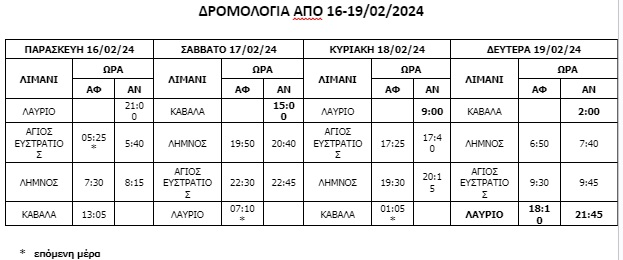 H AEGEAN SEA LINES σας ενημερώνει ότι τα δρομολόγια του Ε/Γ-Ο/Γ ΑΝΕΜΟΣ Ν.Π 12849, το διάστημα από 16/02 έως 19/02 θα εκτελεστούν σύμφωνα με τον ακόλουθο πίνακα.