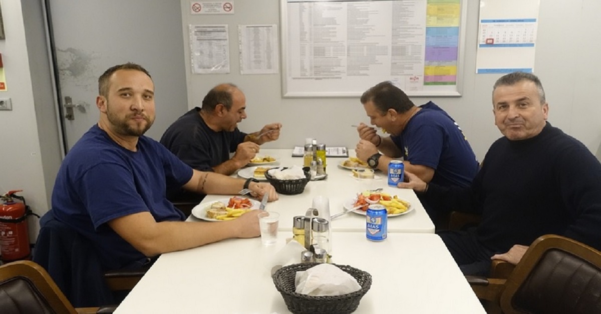 Όμως και το πλήρωμα νοιώθει εξίσου χαρούμενο, όπως φαίνεται από την παραπάνω φωτογραφία, αλλά και όπως εξηγεί, μπουκωμένος, ο πλέον κοινωνικός από τους παριστάμενους. Και καταλήγουμε στο συμπέρασμα που είπε στην αρχή της αφήγησης ο καπετάν Παναγιώτης πως: “ο μάγειρας είναι η χαρά του πλοίου”…