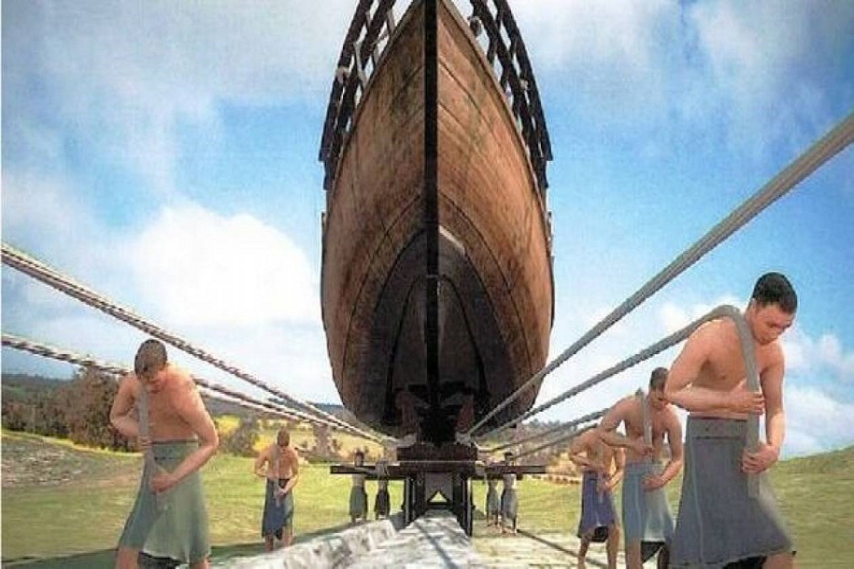 Δηλαδή της ρυμούλκησης των πλοίων στο στενό τμήμα γης του ισθμού, με τη βοήθεια κορμών δέντρων.
