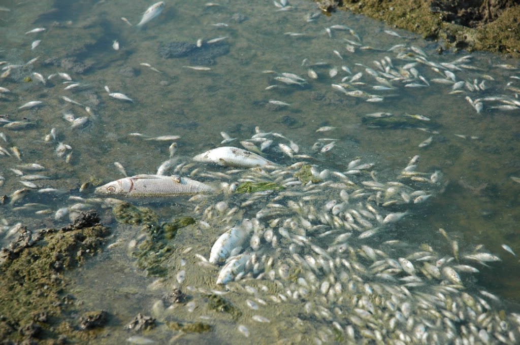 Επί δύο εβδομάδες χιλιάδες νεκρά ψάρια εμφανίζονται στην τάφρο που βρίσκεται δίπλα ακριβώς από το βιολογικό Σταθμό Μεσολογγίου, στο δρόμο που συνδέει την πόλη με τo Τ.Ε.Ι. Μεσολογγίου.