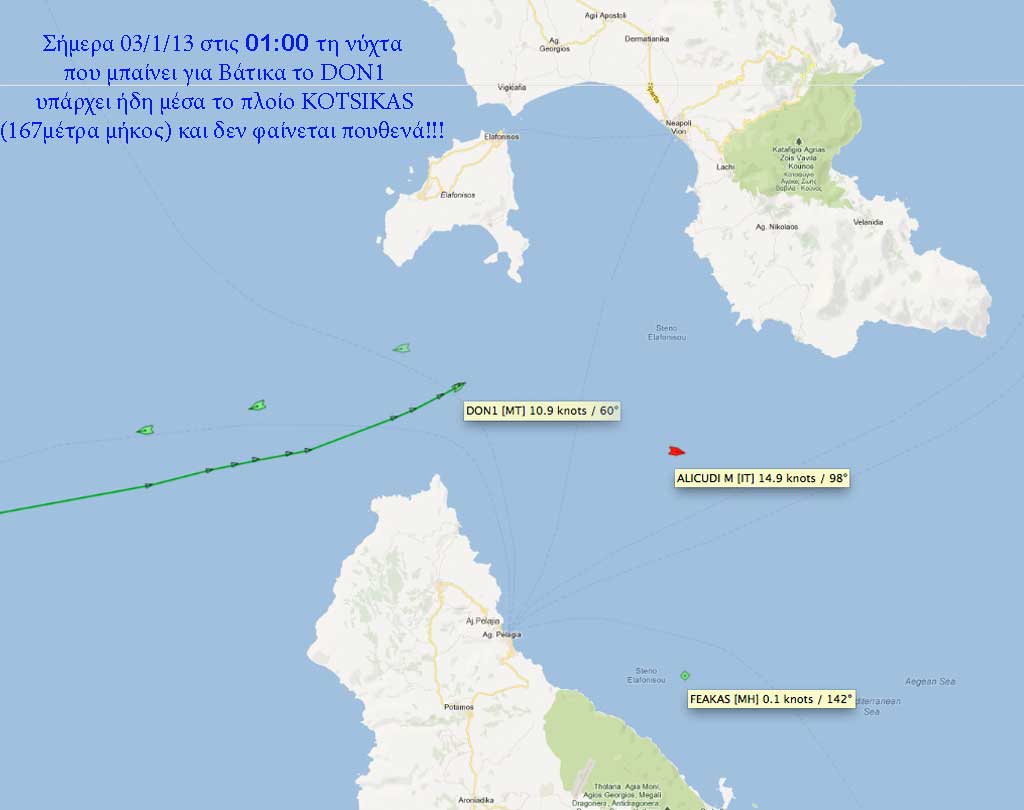 3 Ιανουαρίου 2013, στις 01:00 (Ελλάδος, το ais δουλεύει σε UTC), και τη στιγμή που το πλοίο DON1 μπαίνει στα Βάτικα. O όρμος εμφανίζεται άδειος από πλοία. Έλα μου ντε που δεν είναι έτσι…