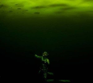 Δύσκολα μπορεί να καταλάβει κανείς τι μπορεί να δείχνει αυτή η φωτογραφία. Μοιάζει με συννεφιασμένο νυχτερινό ουρανό την ώρα του λυκόφωτος, όμως η σιλουέτα ενός δύτη που δείχνει να ίπταται μπερδεύει κάπως τα πράγματα. Από μία τρύπα στην παγωμένη θάλασσα, ο Τζορτζ Κάρμπους και η φίλη του βούτηξαν στο νερό. Ο Κάρμπους, απαθανάτισε τη φίλη του κοντά στην επιφάνεια με φόντο τη λάμψη του βόρειου σέλαος στον πάγο. «Ηταν συγκλονιστική εμπειρία», είπε ο ίδιος. «Ηταν η πρώτη φορά που αντίκριζα το βόρειο σέλας και έμοιαζε απίστευτο. Το φως άλλαζε συνεχώς και η λάμψη του ήταν πολύ έντονη».