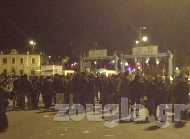 Την ίδια στιγμή συνάδελφοί τους έχουν δημιουργήσει μια ζώνη αποκλεισμού στην προβλήτα της πύλης Ε3, έχοντας απέναντι τους πλήθος απεργών και μελών του ΠΑΜΕ, οι οποίοι φωνάζουν συνθήματα κατά της κυβέρνησης και των Σωμάτων Ασφαλείας