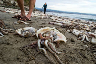 Εκατοντάδες νεκρά γιγάντια καλαμάρια είχαν ξεβραστεί στην παραλία Capitola, ενώ οι γενικές απώλειες υπολογίζονται σε χιλιάδες.