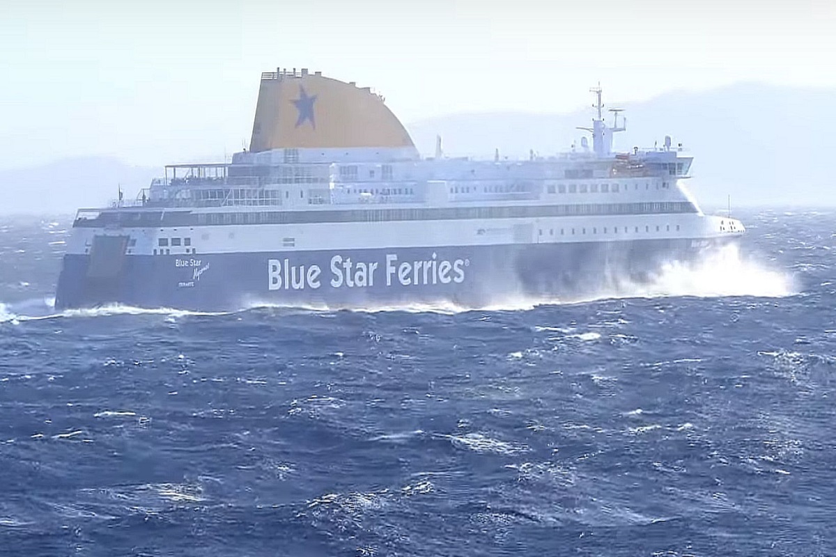 Το Blue Star Myconos ταξιδεύει στο Αιγαίο κόντρα στους ισχυρούς βόρειους ανέμους εντάσεως 7 Beaufort.