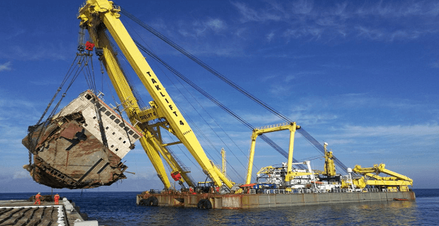 Η γερανογέφυρα πλωτής εξέδρας Taklift 4 της Boskalis χρησιμοποιήθηκε για αυτή την επιχείρησης απομάκρυνσης του ναυαγίου.