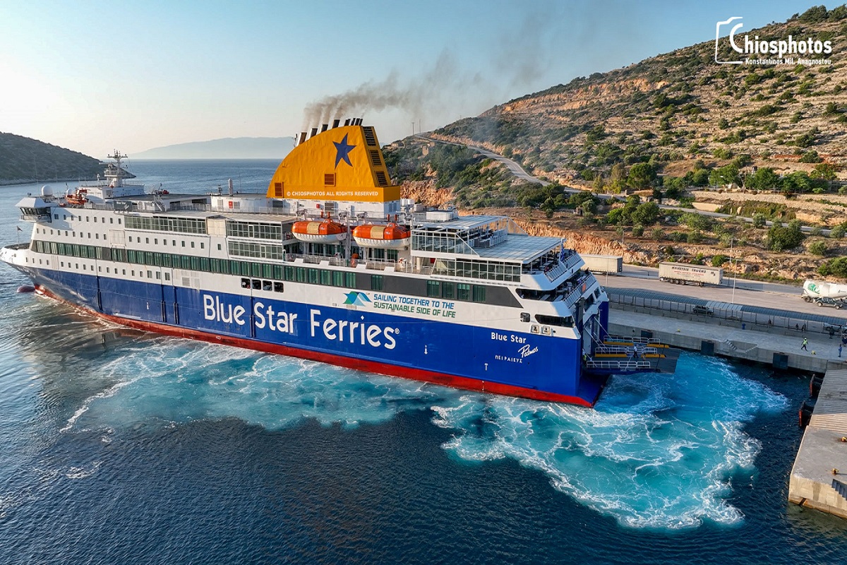 Με μία δεξιοτεχνική μανούβρα και ένα γρήγορο ρεμέτζο λίγων λεπτών ο cpt Μακάριος Λύρας έδεσε το Blue Star Patmos στο λιμάνι Μεστών το απόγευμα του Σαββάτου.