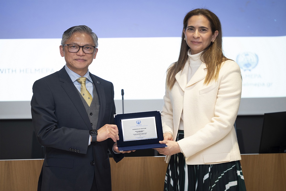 Ως έκφραση της αναγνώρισης της HELMEPAπρος τον IMO και το WMUγια τις μακροχρόνιες και κοινές προσπάθειες για ασφαλή πλοία σε υγιείς θάλασσες,η Πρόεδρος της HELMEPAΣεμίραμις Παληού απένειμε αναμνηστικές πλακέτες στους ArsenioDominguez καιMaxMejia.