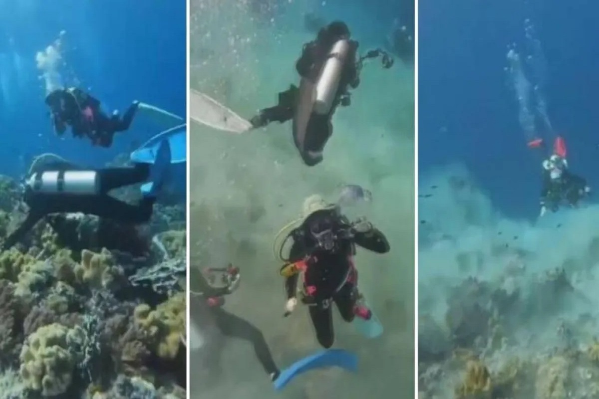 Στο βίντεο που τράβηξαν οι ίδιοι φαίνεται να παρασύρονται με δύναμη μέσα στο νερό, με τον έναν να προσπαθεί να κρατηθεί από κοράλλια προτού εξαφανιστούν όλοι σε ένα υποβρύχιο πέπλο σκόνης.