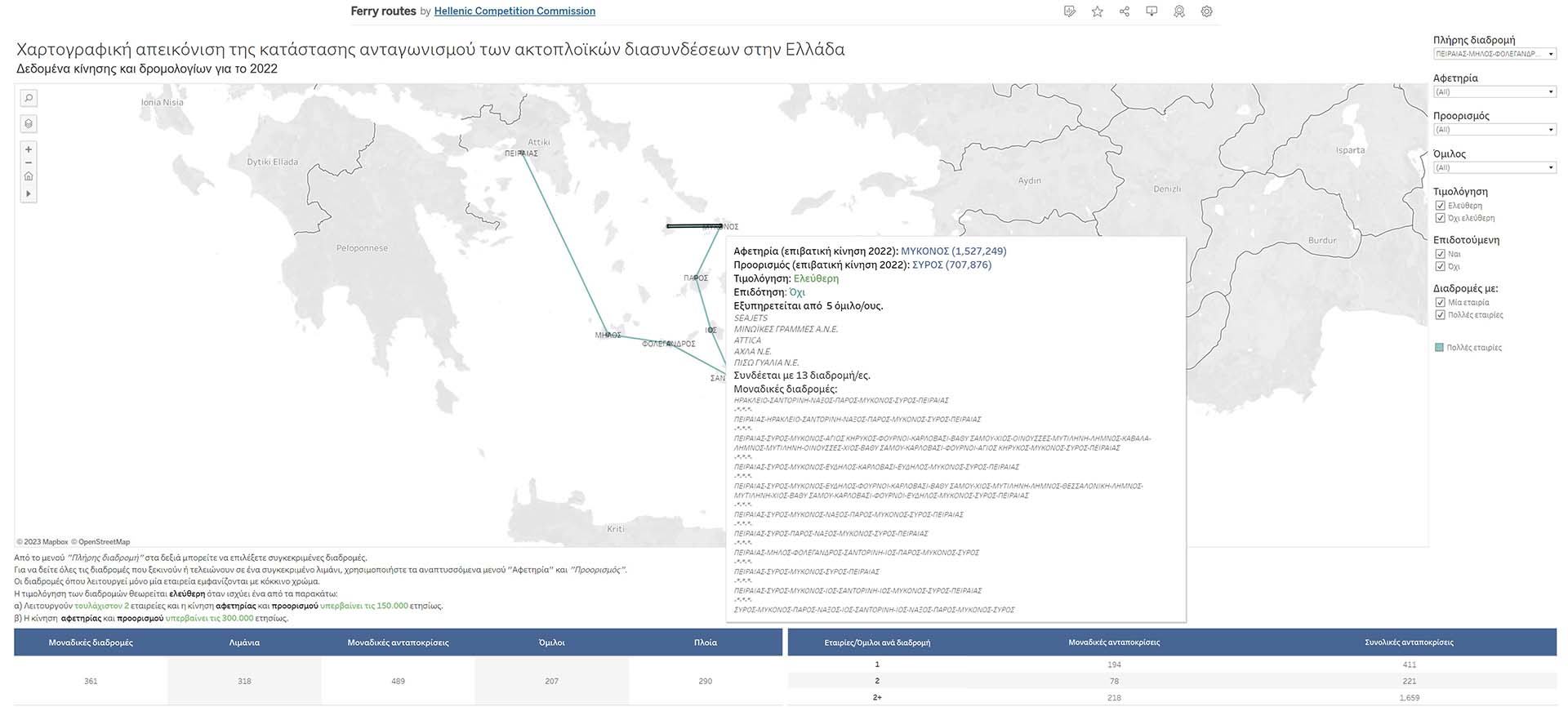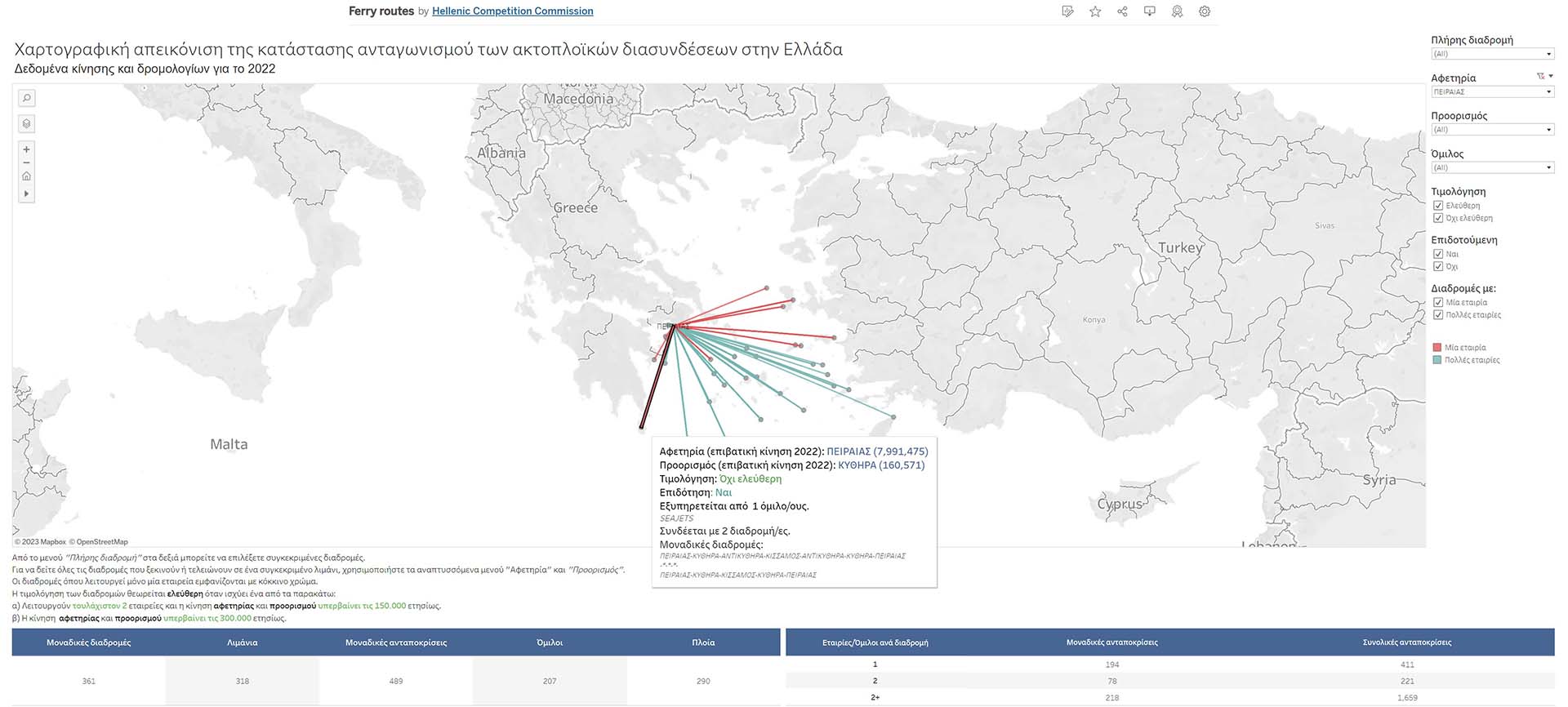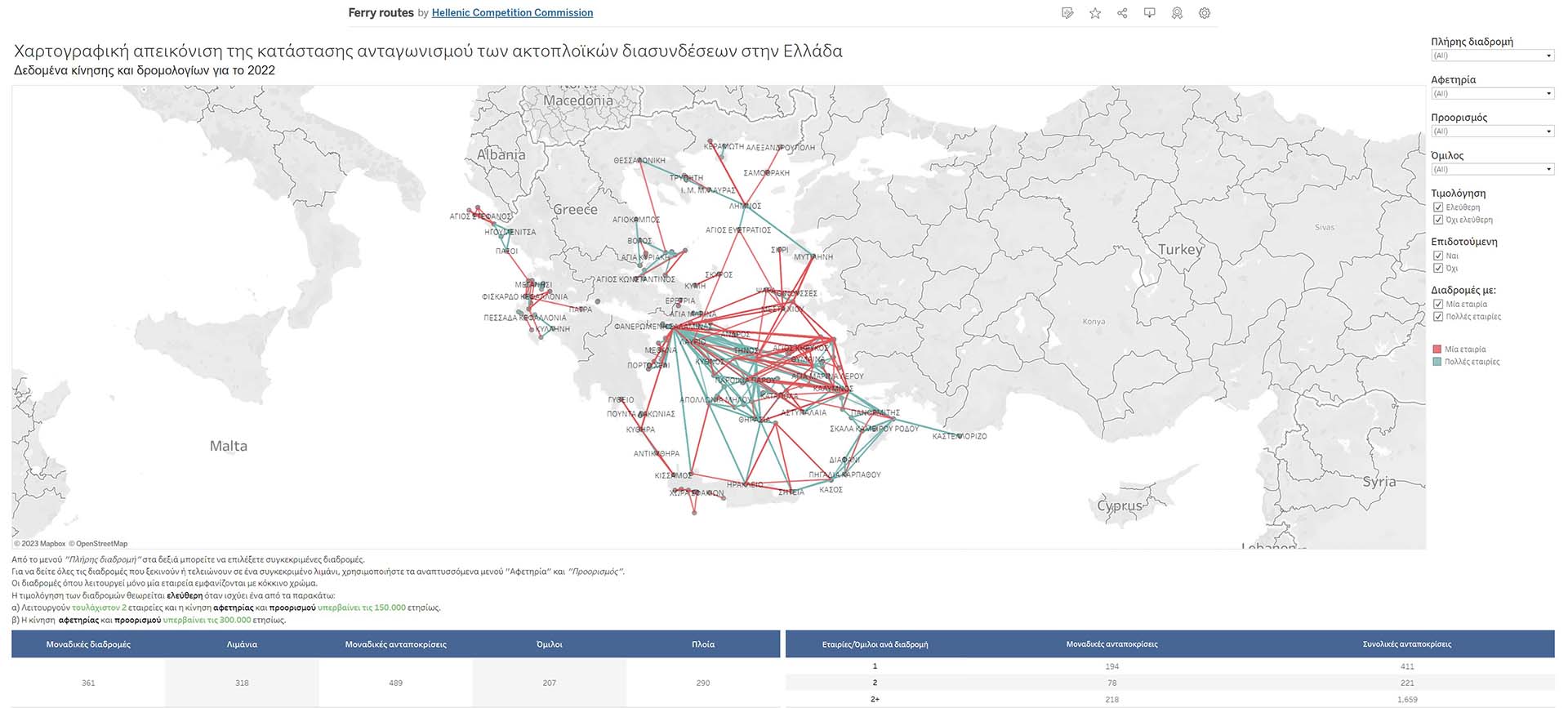 Η ομάδα Επιστήμης Δεδομένων της Επιτροπής Ανταγωνισμού (ΕΑ) ανέπτυξε μια διαδραστική χαρτογραφική απεικόνιση της κατάστασης ανταγωνισμού των ακτοπλοϊκών διασυνδέσεων στην Ελλάδα. Το εργαλείο αυτό, βασισμένο σε δημόσια διαθέσιμα δεδομένα προσφέρει στους πολίτες μια λεπτομερή εικόνα των δρομολογιακών γραμμών που εξυπηρετούνται από διάφορες ακτοπλοϊκές εταιρείες και συνεπώς μία πρώτη εικόνα της δομής των συγκεκριμένων αγορών. Σε δεύτερο στάδιο η ΕΑ θα εμπλουτίσει, μεταξύ άλλων, την πλατφόρμα και με δεδομένα τιμών (ανά μίλι) με επικαιροποίηση τρεις φορές το έτος, με σκοπό την καλύτερη παρακολούθηση της αγοράς και την αποτελεσματικότερη παρέμβασή της στις αγορές αυτές.
