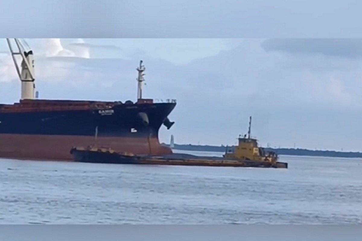 Φορτηγίδα παρασύρθηκε από το ισχυρό ρεύμα και έπεσε πάνω σε αγκυροβολημένο πλοίο (video)