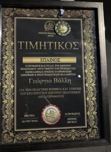 Για το φιλανθρωπικό του έργο τιμήθηκε ο cpt. Γιώργος Βάλλης από τη πρόεδρο του κέντρου πολιτισμού ΑΡΓΩ, Ειρήνη Βέγκου. Αρχικά έκανε αναφορά για το πρόεδρο και το έργο της ένωσης . Επιγραμματικά ανέφερε τις προτάσεις που έχει κάνει στα αρμόδια υπουργεία σχετικά με το κλάδο της ναυτιλίας. Η ίση μεταχείριση για τις γυναίκες ναυτικούς και η καταβολή επιδόματος σε περίοδο εγκυμοσύνης. Η πρόταση για τηλεϊατρική εν πλώ και η δωρεά συσκευής επείγουσας τηλεκαρδιολογίας σε ακριτικό νησί και σε ένα πλωτό του Λιμενικού. Η συνεργασία με τη Δίωξη Ηλεκτρονικού Εγκλήματος για τις παράνομες ναυτικές φωτοβολίδες. Η προβολή των προβλημάτων στο ελληνικό yachting και την ιδιωτική φορολόγηση στα σκάφη αναψυχής. Τα φιλανθρωπικά του έργα που έχουν στηρίξει αμέτρητο κόσμο. Ένας χρόνος βοήθειας και προσφοράς για τους συνανθρώπους μας που έχουν ανάγκη, γεμίζοντάς τους αγάπη και χαρά.