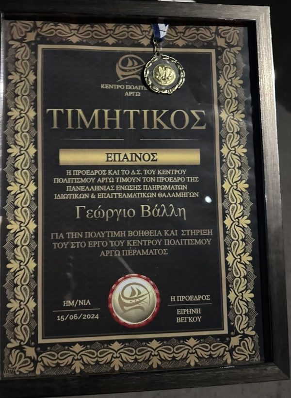 Με τιμητική πλακέτα βραβεύτηκε το Σάββατο 15/6 ο cpt. Γιώργος Βάλλης, Πρόεδρος της Πανελλήνιας Ένωσης Πληρωμάτων Ιδιωτικών και Επαγγελματικών Θαλαμηγών.