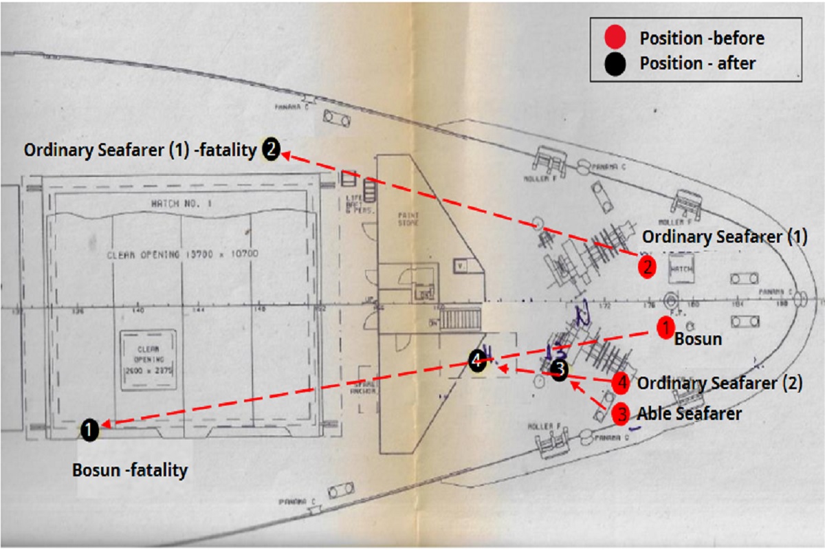Τέσσερα μέλη του πληρώματος βρίσκονταν στην πλώρη για να ασφαλίσουν τους κάβους πρόσδεσης όταν το πλοίο χτυπήθηκε από μια σειρά μεγάλων κυμάτων, παρασύροντας τα τέσσερα μέλη του πληρώματος και χτυπώντας τα στο κατάστρωμα και στις υπερκατασκευές του πλοίου.