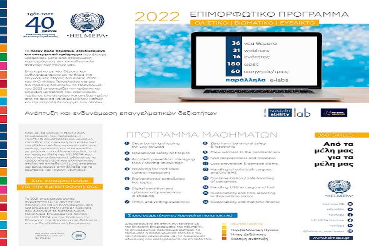 Για πρώτη φορά, το επιμορφωτικό πρόγραμμα της HELMEPA διευρύνεται και προσφέρεται σε περισσότερους οργανισμούς και εταιρείες, και εκτός του ευρύτερου ναυτιλιακού χώρου, περιλαμβάνοντας 16 θεματικές ενότητες, με περισσότερα από 50 επιμέρους θέματα, μέσα από 34 προγραμματισμένα webinars που θα διεξαχθούν κατά τη διάρκεια του έτους.