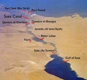 Αρχίζει από το Πορτ Σάιντ, λιμένα εισόδου στη Μεσόγειο και καταλήγει στον λιμένα Σουέζ που βρίσκεται στο μυχό του ομώνυμου κόλπου της Ερυθράς.