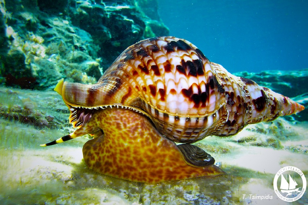 Η Μπουρού (Charonia variegata) με το εντυπωσιακό της κοχύλι απειλείται στις θάλασσές μας από την παράνομη αλίευση.