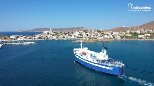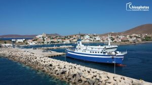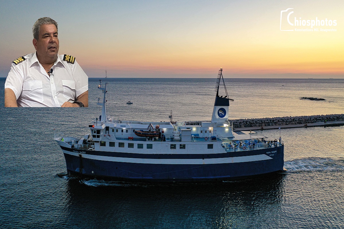 Το ταξίδι μας ξεκίνησε πρωί του Σαββάτου από το λιμάνι της Χίου με προορισμό τα Ψαρά. Ο Δημήτρης είχε αποφασίσει η εκπομπή μας να γίνει εν πλω στο φυσικό χώρο του Καπετάν Μάρκου. Λίγο μετά την αναχώρηση μας από το λιμάνι της Χίου ανέβηκα στη γέφυρα να φωνάξω τον καπετάν Μάρκο να κατέβει στο σαλόνι για να ξεκινήσουμε την εκπομπή. Εκείνος ευγενικά μου ζήτησε να περιμένουμε λίγο ώσπου το πλοίο να περάσει από την παραθαλάσσια Μονή Μυρσινιδίου βόρεια του Βροντάδου.