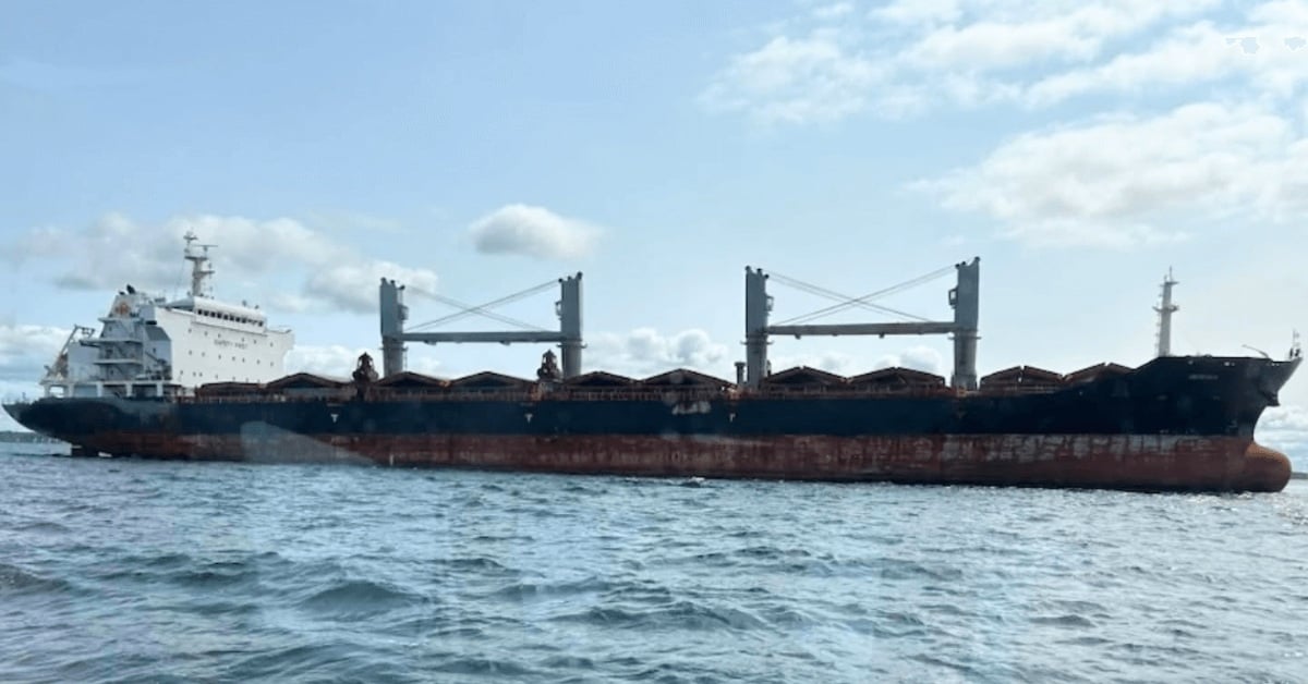 Εικόνες που καταγράφηκαν τη Δευτέρα (15) δείχνουν το πλοίο προσαραγμένο και ακινητοποιημένο.