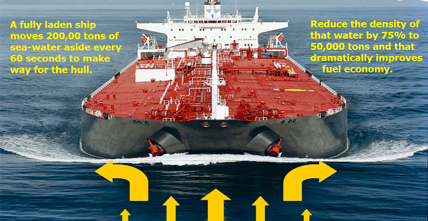 “Δεν είναι δύσκολο να δούμε ότι πολλή ισχύς που παράγεται από τους κινητήρες πρόωσης χρησιμοποιείται για να σπρώξει μεγάλες μάζες θαλασσινού νερού να ανοίξουν τον δρόμο για το πλοίο. Αυτό συμβαίνει ξανά και ξανά, κάθε 60 δευτερόλεπτα για όλη τη διάρκεια του ταξιδιού ενός πλοίου. Πολλά καύσιμα σπαταλιούνται, για την απομάκρυνση περίπου οκτώ δισεκατομμυρίων τόνων θαλασσινού νερού κατά τη διάρκεια ενός ταξιδιού 31 ημερών”, λέει ο Kinman.