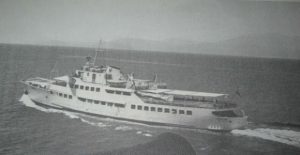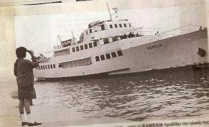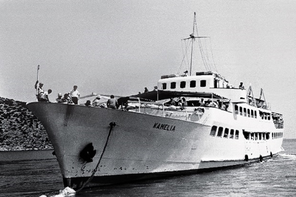Στιγμιότυπο από το φιλμ «Η Δοσατζού» του 1966. Το ακτοπλοϊκό Καμέλια ταξιδεύει στον Αργοσαρωνικό. Εμφανίζεται και το «Αίγινα» εν πλω