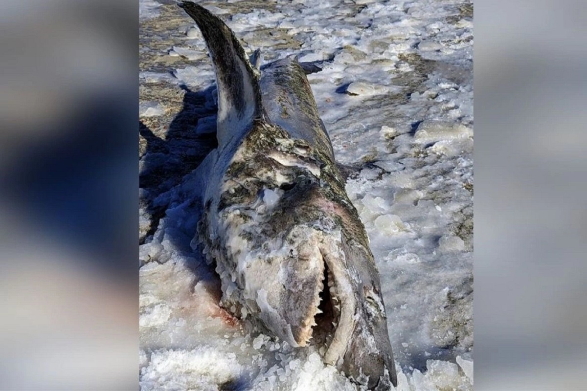 Ένας νεκρός και… κατεψυγμένος καρχαρίας ξεβράστηκε στην παγωμένη παραλία στο Κέιπ Κοντ της Μασαχουσέτης το περασμένο Σαββατοκύριακο.