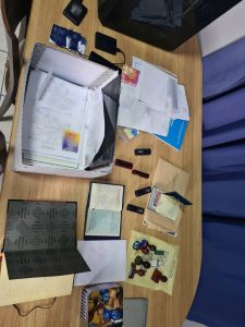 Δύο (02) ηλεκτρονικοί υπολογιστές, δύο (02) εκτυπωτές, ένα (01) μηχάνημα κοπής χαρτιού, ένα (01) scanner, δεκατέσσερα (14) στικάκια αποθήκευσης usb, ένα (01) κινητό τηλέφωνο, χειρόγραφες σημειώσεις με χρηματικά ποσά, ένα (01) πιστόλι 9mm, ένας (01) σιγαστήρας, τριάντα τρία (33) αβολίδωτα φυσίγγια και πλήθος εγγράφων, ενδεικτικά αναφέρονται τραπεζικές επιταγές, φωτοαντίγραφα Απολυτηρίων λυκείου, φωτογραφίες, Πιστοποιητικά Υπηρεσίας – Certificate of service, βιβλία αδείας χειριστή μηχανημάτων έργου, τραπεζικές επιταγές, ιατρικές γνωματεύσεις κ.λ.π.