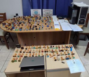 Δύο (02) εξωτερικές μονάδες (Πύργοι) και ένα (01) USB STICK, έντεκα (11) Πιστοποιητικά Διεθνούς Σύμβασης STCW, εβδομήντα τέσσερα (74) Πιστοποιητικά Υπηρεσίας – Certificate of service, διάφορα Πιστοποιητικά επάρκειας – ικανότητας, έγγραφα, έξι (06) απολυτήρια ΕΠΑΛ – γενικού λυκείου, δεκαέξι (16) συνοδευτικά δελτία ταχυμεταφοράς, πλήθος φακέλων από εταιρείες ταχυμεταφορών, πλήθος χειρόγραφων σημειώσεων με ονοματεπώνυμα και ημερομηνίες, τρία (03) σημειωματάρια με ιδιόχειρες σημειώσεις, μία (01) πλαστική σακούλα με πλήθος φωτογραφιών, ένας (01) φορητός υπολογιστής, ενενήντα οχτώ (98) σφραγίδες πλοίων, εννέα (09) σφραγίδες εταιρειών, μία (01) σφραγίδα Λιμενικού Σώματος, τέσσερις (04) σφραγίδες Λιμενικών Αρχών, εννέα (09) λοιπές σφραγίδες, δεκατρείς (13) προσωπικές – ατομικές σφραγίδες, επτά (07) στρογγυλές σφραγίδες προξενείων, μία (01) σφραγίδα δημοτικής αρχής.