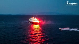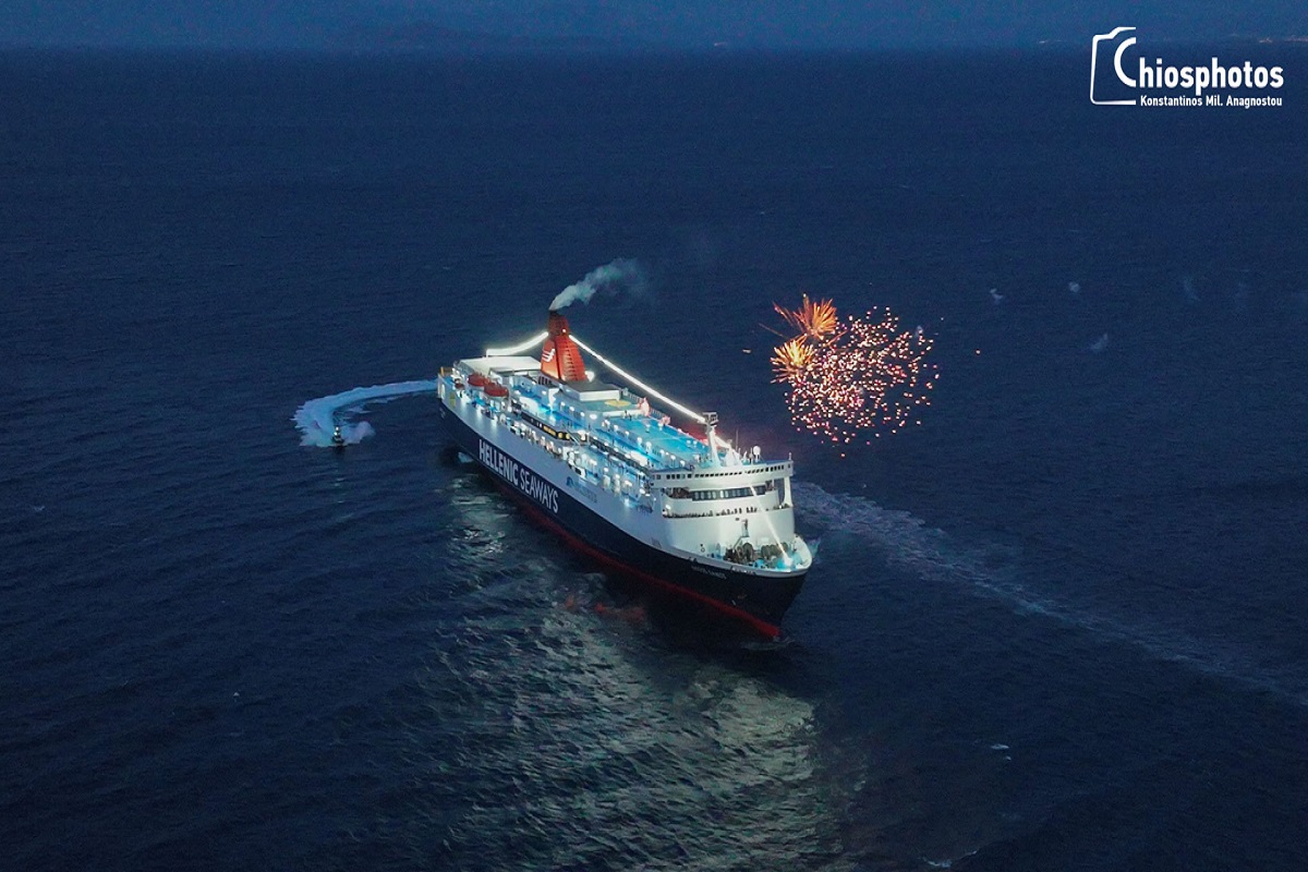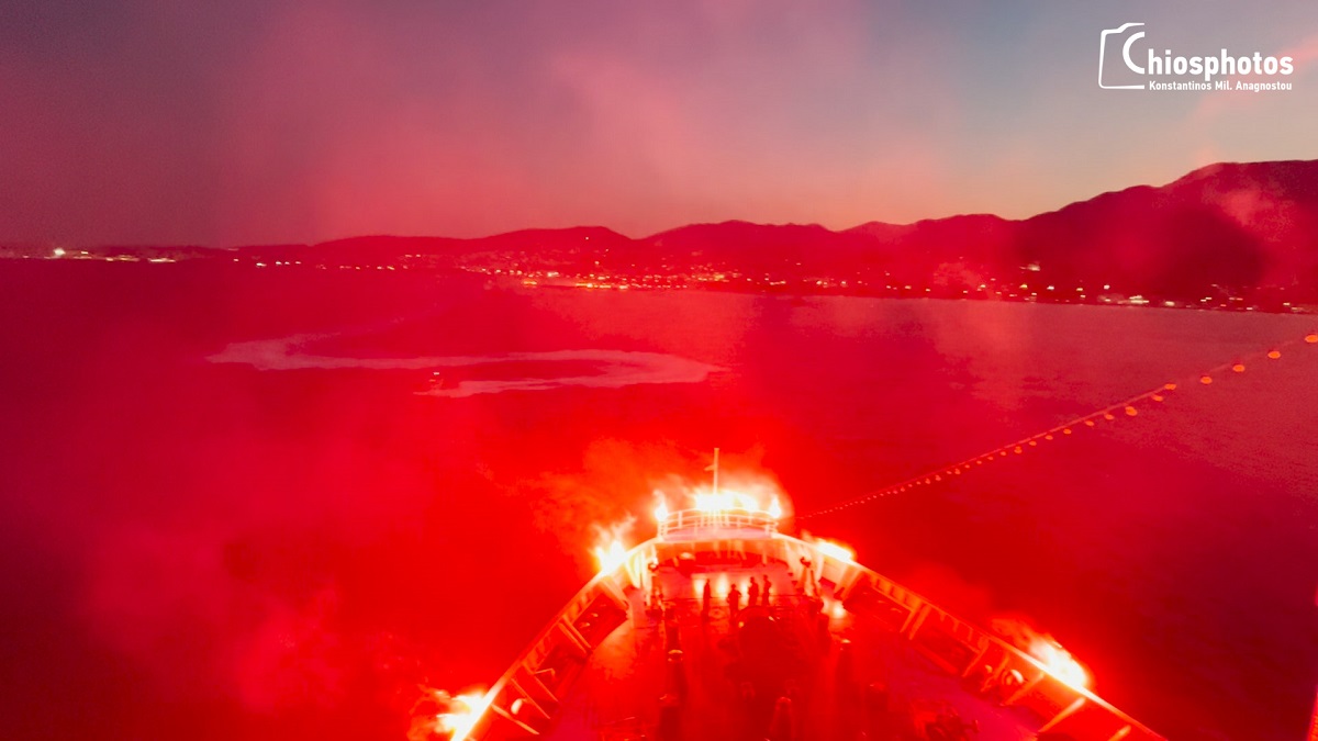 Ιδιαίτερα εντυπωσιακό ήταν και το πλοίο της γραμμής Νήσος Σάμος όπου απέδωσε τιμές με βεγγαλικά και συριγμούς, δημιουργώντας μία φαντασμαγορική ατμόσφαιρα στους προσκυνητές.