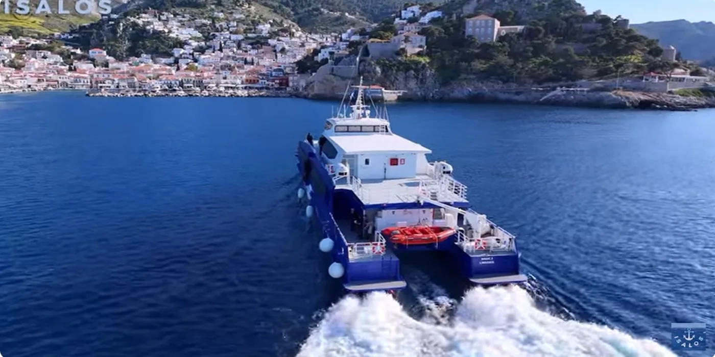 To νεότευκτο ταχύπλοο Magic 2 προσεγγίζει το λιμάνι της Ύδρας ερχόμενο από Πόρο και Πειραιά και πραγματοποιεί μια γρήγορη πλαγιοδέτηση στο γραφικό λιμάνι του νησιού, σε ένα από τα πρώτα του ταξίδια στα ελληνικά νερά.
