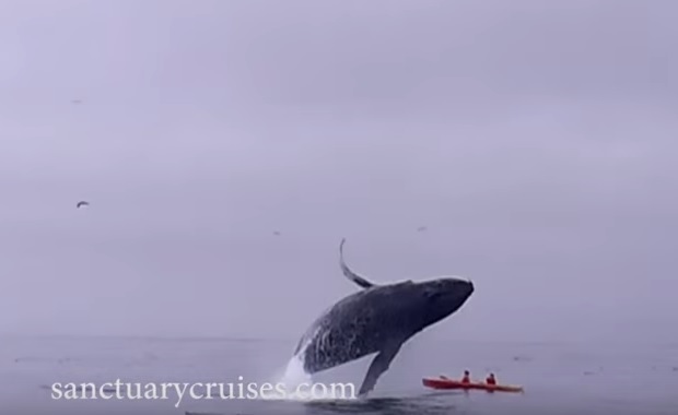Μία ομάδα από καγιάκερ, το Σάββατο που μας πέρασε, παρακολουθούν τις μεγάπτερες φάλαινες στο Monterey Bay της Καλιφόρνια, όταν μία από αυτές κάνει ένα τεράστιο άλμα έξω από το νερό.