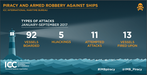 Συνολικά καταγράφηκαν 121 περιστατικά πειρατείας και ένοπλης ληστείας κατά πλοίων, ενώ ειδικότερα σε 92 πλοία υπήρξε έφοδος από πειρατές, 13 πυρπολήθηκαν, 11 δέχτηκαν επιθέσεις και 5 κατελήφθησαν από πειρατές, μέχρι και τον Σεπτέμβριο του 2017