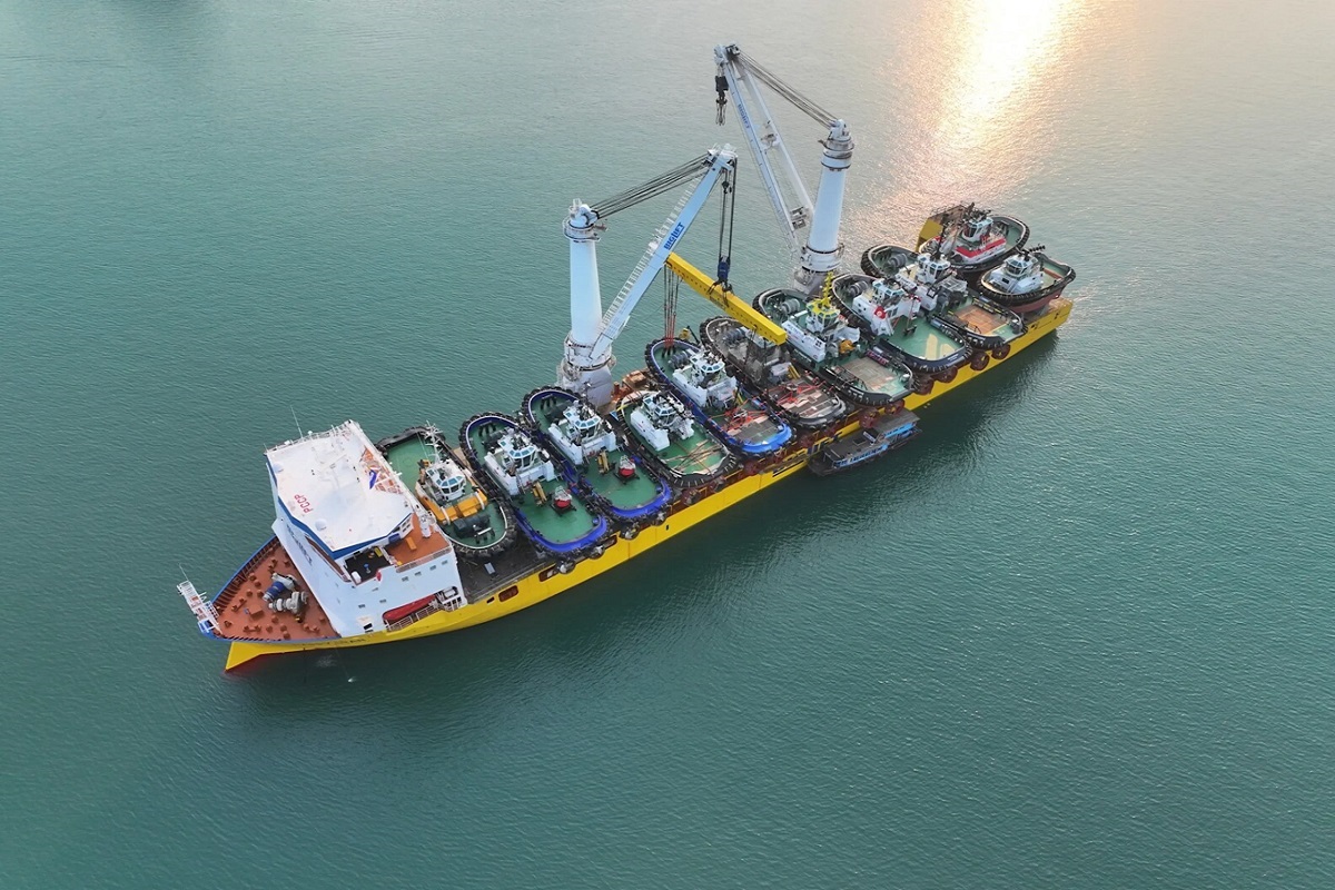 Μια εντυπωσιακή φωτογραφία ήρθε στη δημοσιότητα από το πλοίο ανύψωσης βαρέων βαρών Happy Star, το φόρτωσε και μετέφερε 11 ρυμούλκα από την Ασία προς την Ευρώπη.