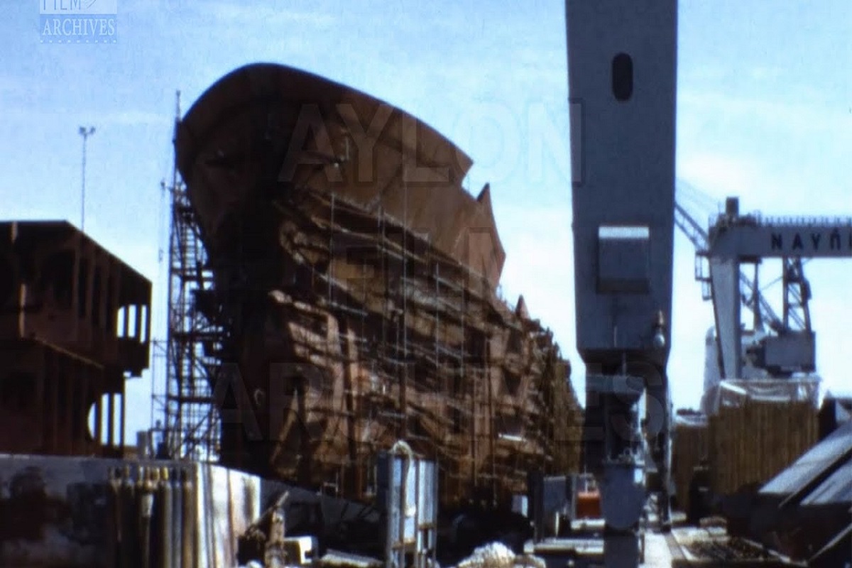 Στη μοναδική αυτή ταινία, που μας δίνει τη δυνατότητα περιήγησης στους χώρους των Ναυπηγείων, βλέπουμε τεράστιους γερανούς, κλίνες όπου το πλοίο υπόκειται στην τελική του συναρμολόγηση και καθέλκυση, σκαριά που δημιουργούνται σιγά – σιγά, πλωτές δεξαμενές και πολλά άλλα.