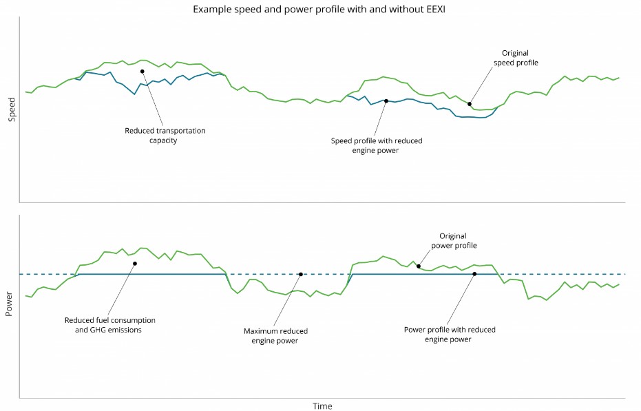 Το EEXI, το οποίο εγκρίθηκε τον Ιούνιο του τρέχοντος έτους και πρόκειται να τεθεί σε ισχύ την 1η Νοεμβρίου 2022, με την απαίτηση να τίθεται σε ισχύ την 1η Ιανουαρίου 2023, αξιολογεί και περιορίζει τις εκπομπές CO2 ανά μεταφορικό έργο με βάση μόνο τις προδιαγραφές σχεδιασμού του πλοίου. Μία από τις πιο διαδεδομένες μεθόδους συμμόρφωσης με το EEXI είναι ο περιορισμός της ισχύος του κινητήρα.