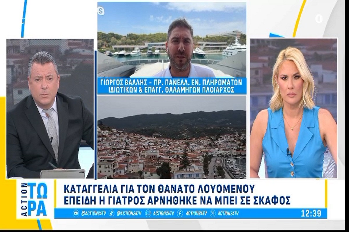 Ο Πρόεδρος της Πανελλήνιας Ένωσης Πληρωμάτων Ιδιωτικών και Επαγγελματικών Θαλαμηγών, Cpt. Γιώργος Βάλλης, σήμερα 11.6.2024, συνομίλησε διαδικτυακά με τους δημοσιογράφους κύριο Νίκο Υποφάντη και κυρία Ντόρα Κουτροκόη στο κανάλι ACTION 24, στην εκπομπή ΤΩΡΑ.