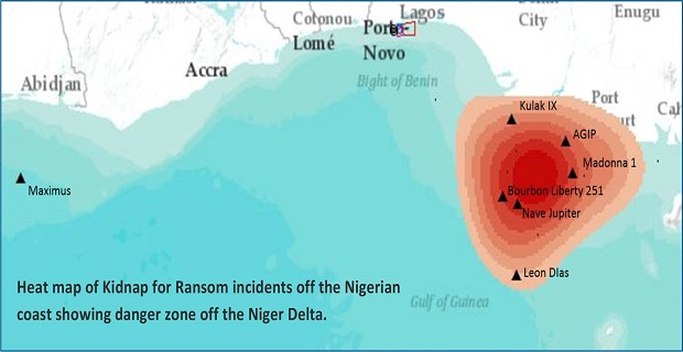 Απεικόνιση σε χάρτη της “θερμής ζώνης” πειρατικών περιστατικών απαγωγών για λύτρα στ’ ανοιχτά του Δέλτα της Νίγηρας