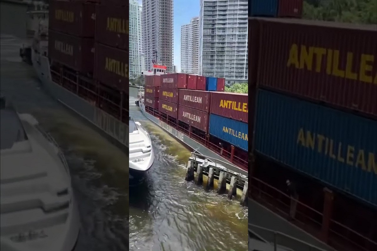 Footage was sent in of an Antillean Line ship that appears have hit a barrier under the Brickell Avenue Bridge! | #ONLYinDADE pic.twitter.com/Dg5g6pbEHS