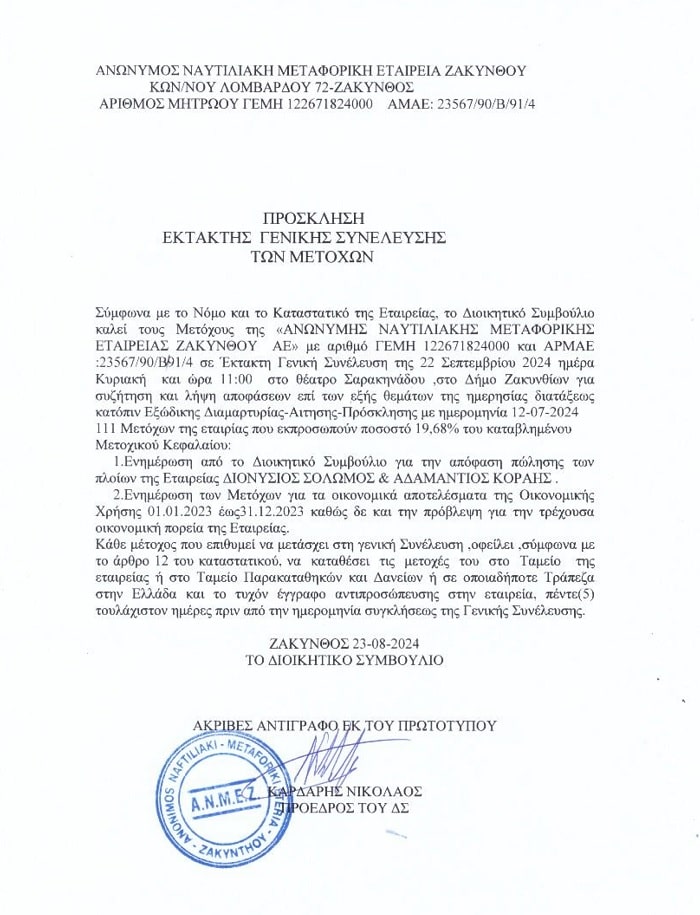Η ναυτιλιακή εταιρία «ZANTE FERRIES» με ανακοίνωσή της καλεί τους μετόχους της σε έκτακτη γενική συνέλευση, την Κυριακή 22 Σεπτεμβρίου 2024 και ώρα 11.00, στη Ζάκυνθο, όπου μεταξύ άλλων θα ανακοινωθεί και η απόφαση της εταιρείας για πώληση των δύο πλοίων της, «Διονύσιος Σολωμός» και «Αδαμάντιος Κοραής».