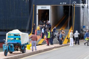 Το “Ν. Σάμος” μετέφερε συνολικά 332 επιβάτες, 104 φορτηγά, 83 Ι.Χ. αυτοκίνητα και 18 δίκυκλα (για τη Χίο 180 επιβάτες, 50 φορτηγά, 33 Ι.Χ. αυτοκίνητα και 11 δίκυκλα).