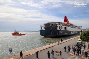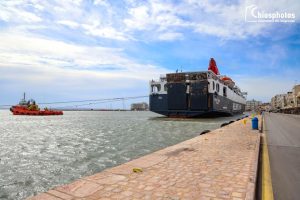 Το πλοίο ΕΓ/ΟΓ πλοίο Νήσος Σάμος προερχόμενο από Πειραιά απέτυχε να δέσει στο λιμάνι της Χίου και στη συνέχεια προσέκρουσε στην προβλήτα λόγω των θυελλωδών ανέμων 8-9 μποφόρ που πνέουν από το πρωί στο νησί. Παρά τις ηρωικές προσπάθειες του καπετάνιου και του ρυμουλκού οι δυνατοί άνεμοι οδήγησαν το πλοίο νότια του λιμανιού όπου τα νερά είναι πιο ρηχά και το έριξαν πάνω στην προβλήτα. Στη συνέχεια αποβίβασε τους επιβάτες ανοίγοντας την μία μπουκαπόρτα. Τελικά γύρω στις 10:00 κατάφερε να αποκολληθεί και να δέσει με ασφάλεια στην προβλήτα.