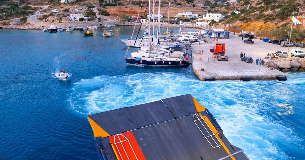 Στη συνέχεια, εισέρχεται με την πρύμνη στον βαθύ κόλπο δένοντας με ακρίβεια στη μικρή προβλήτα όπου αποβιβάζονται και επιβιβάζονται οχήματα και επιβάτες. Το πλοίο αναχωρεί έπειτα για Ηρακλειά.