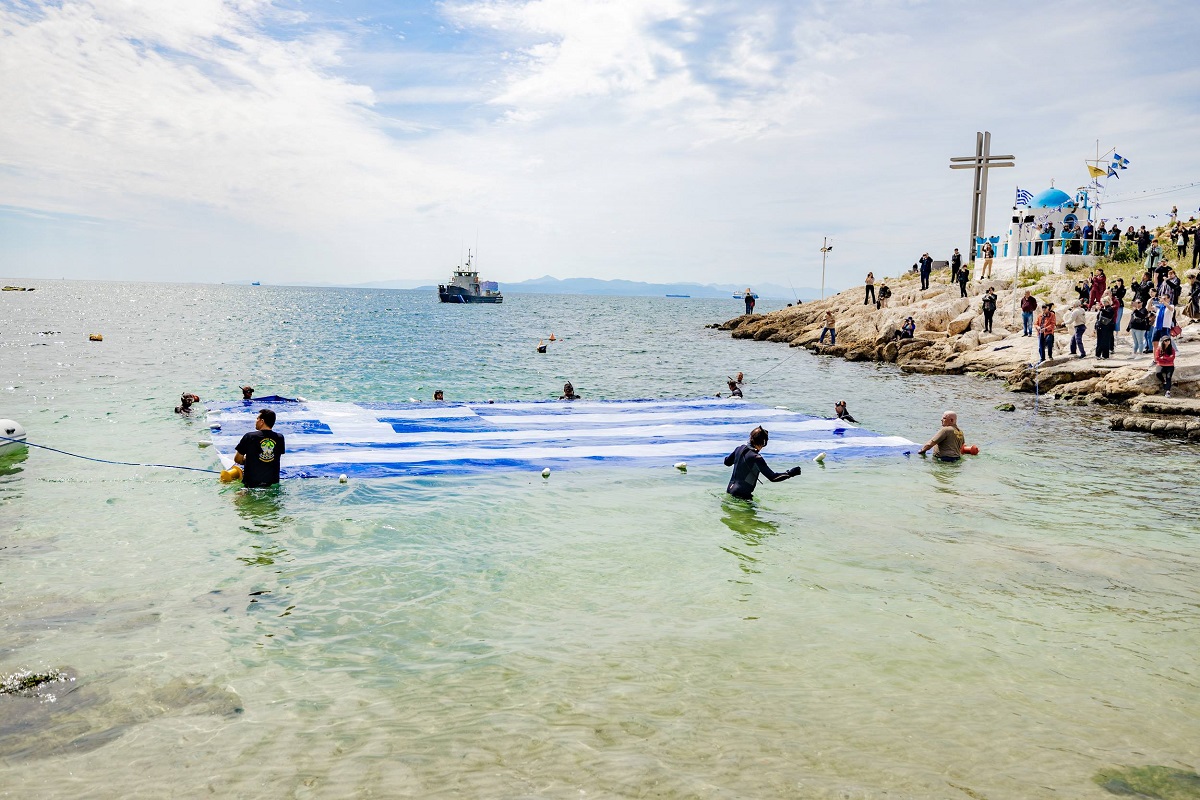 Αισθήματα εθνικής υπερηφάνειας προκάλεσε η θέα της Γαλανόλευκης στην επιφάνεια της θάλασσας, στον Όρμο της Αφροδίτης στην Πειραϊκή, την οποία τοποθέτησε σήμερα, για ακόμη μια χρονιά, ο Δήμος Πειραιά, τιμώντας με αυτό τον τρόπο τις ηρωικές μάχες των Ελλήνων στη θάλασσα.