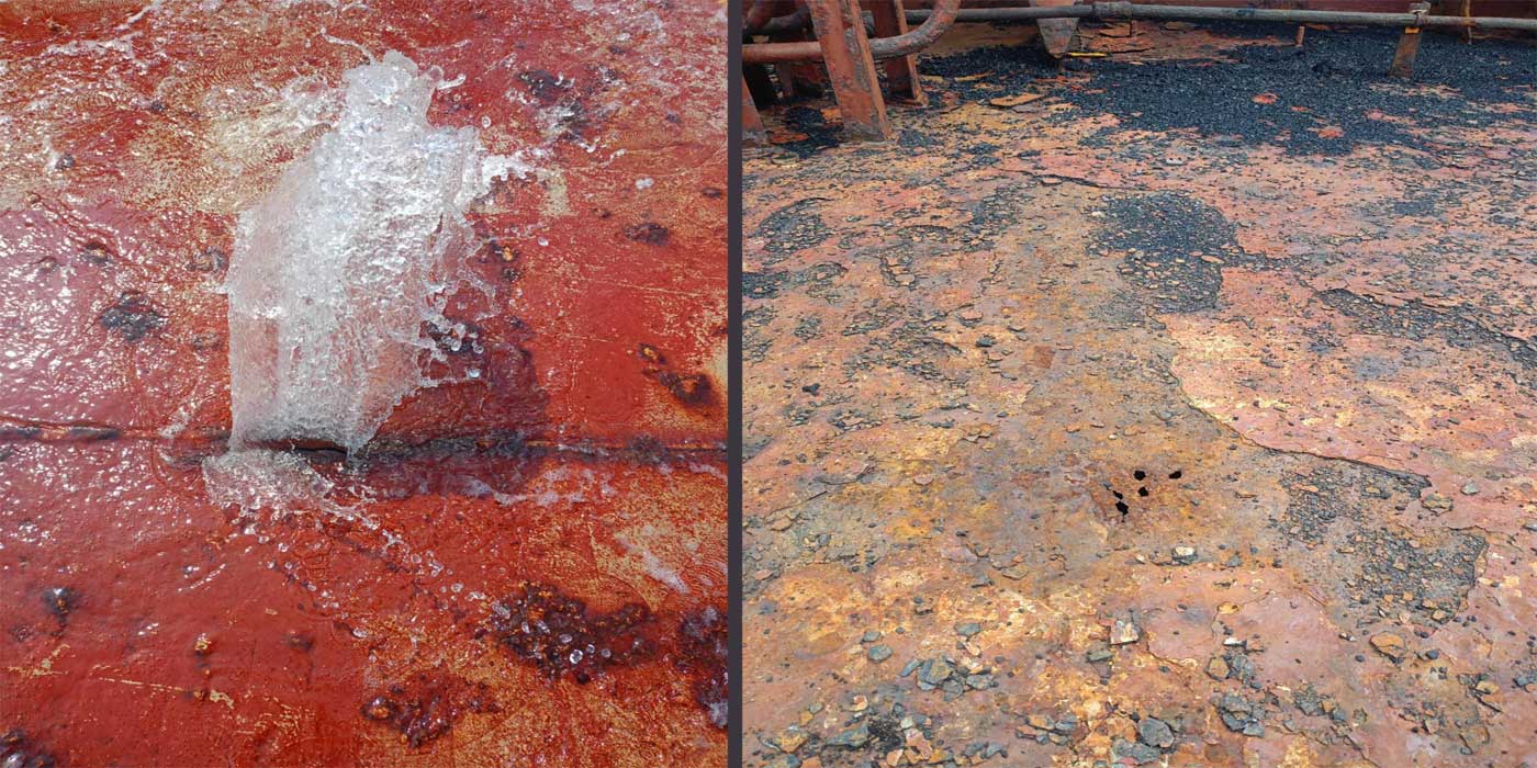 Οι φωτογραφίες δείχνουν ξεκάθαρα μια τρύπα στην πλαϊνή δεξαμενή έρματος του πλοίου, που θέτει όλα τα μέλη του πληρώματος σε κίνδυνο.